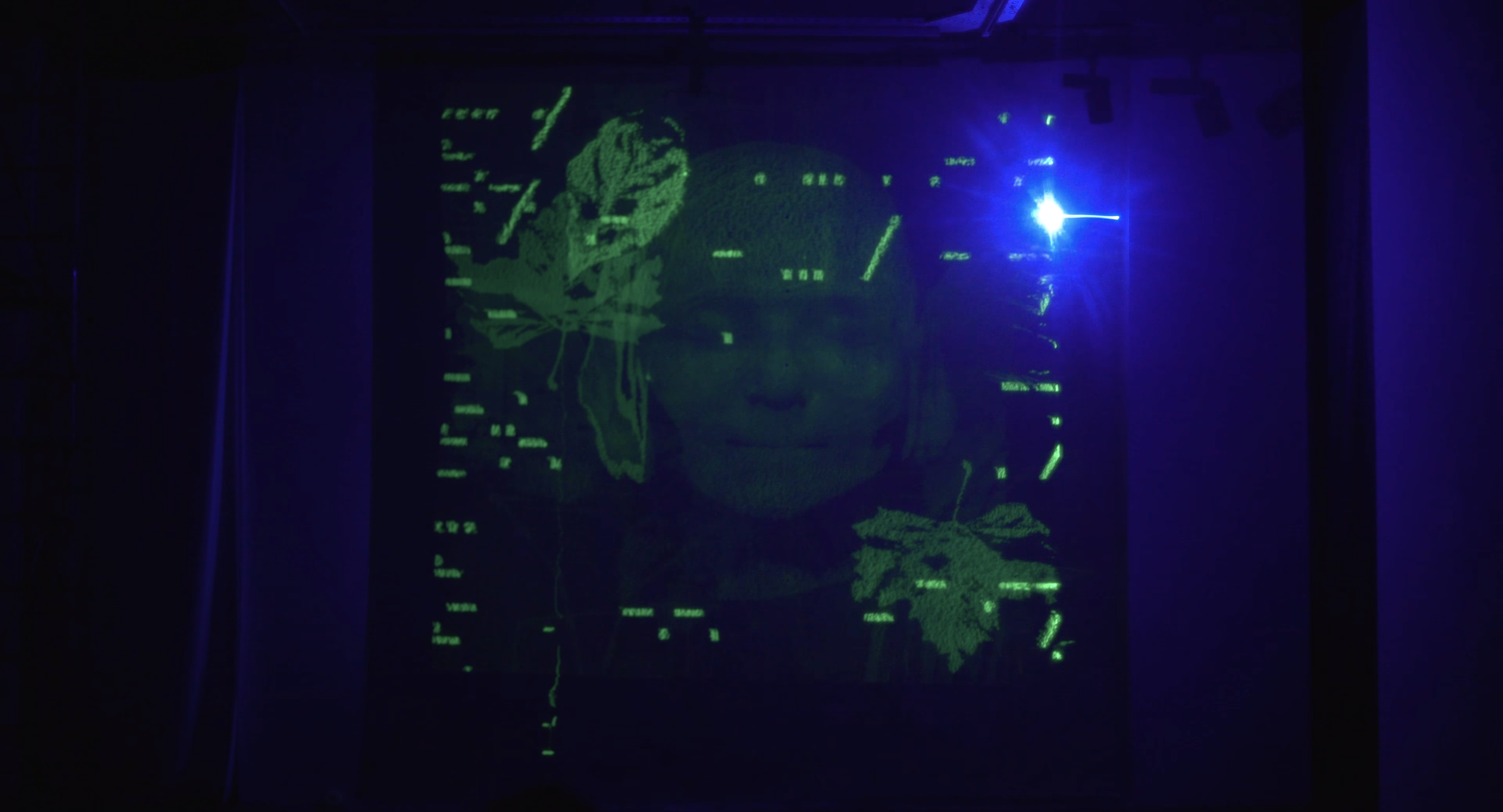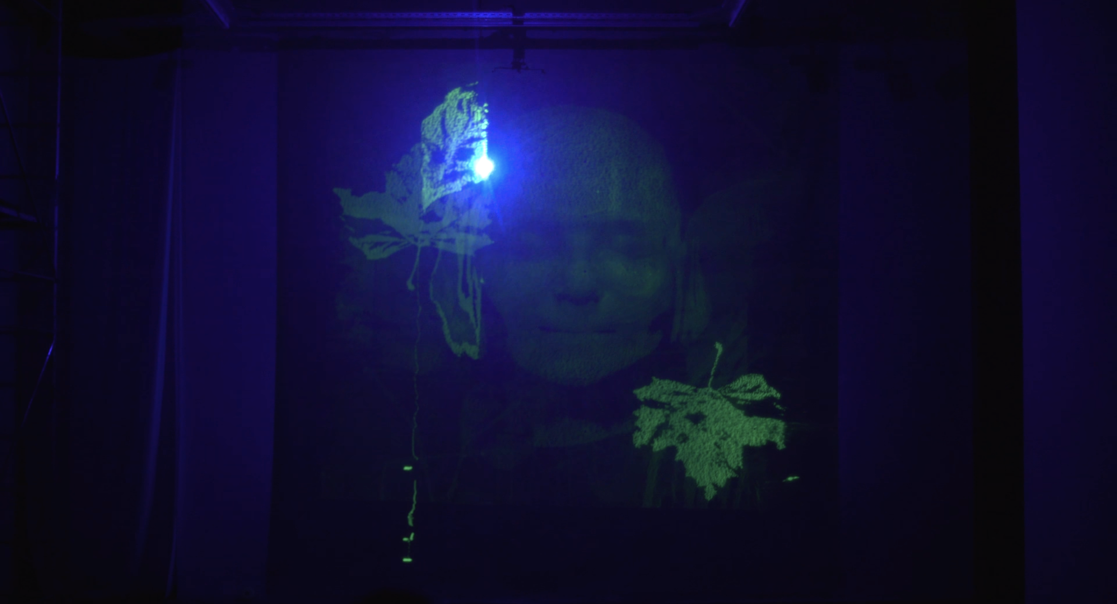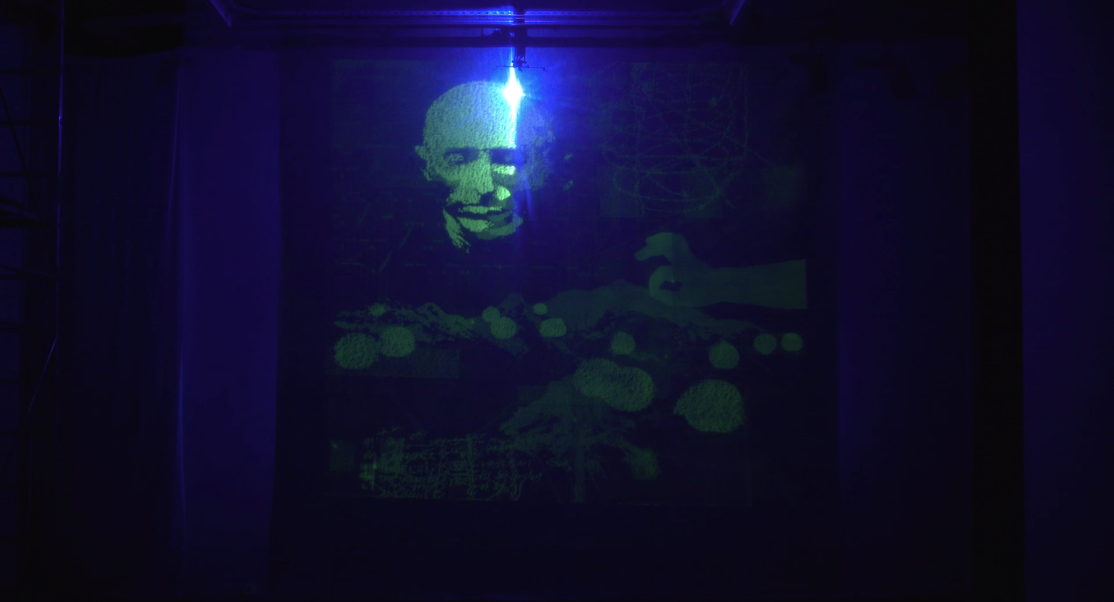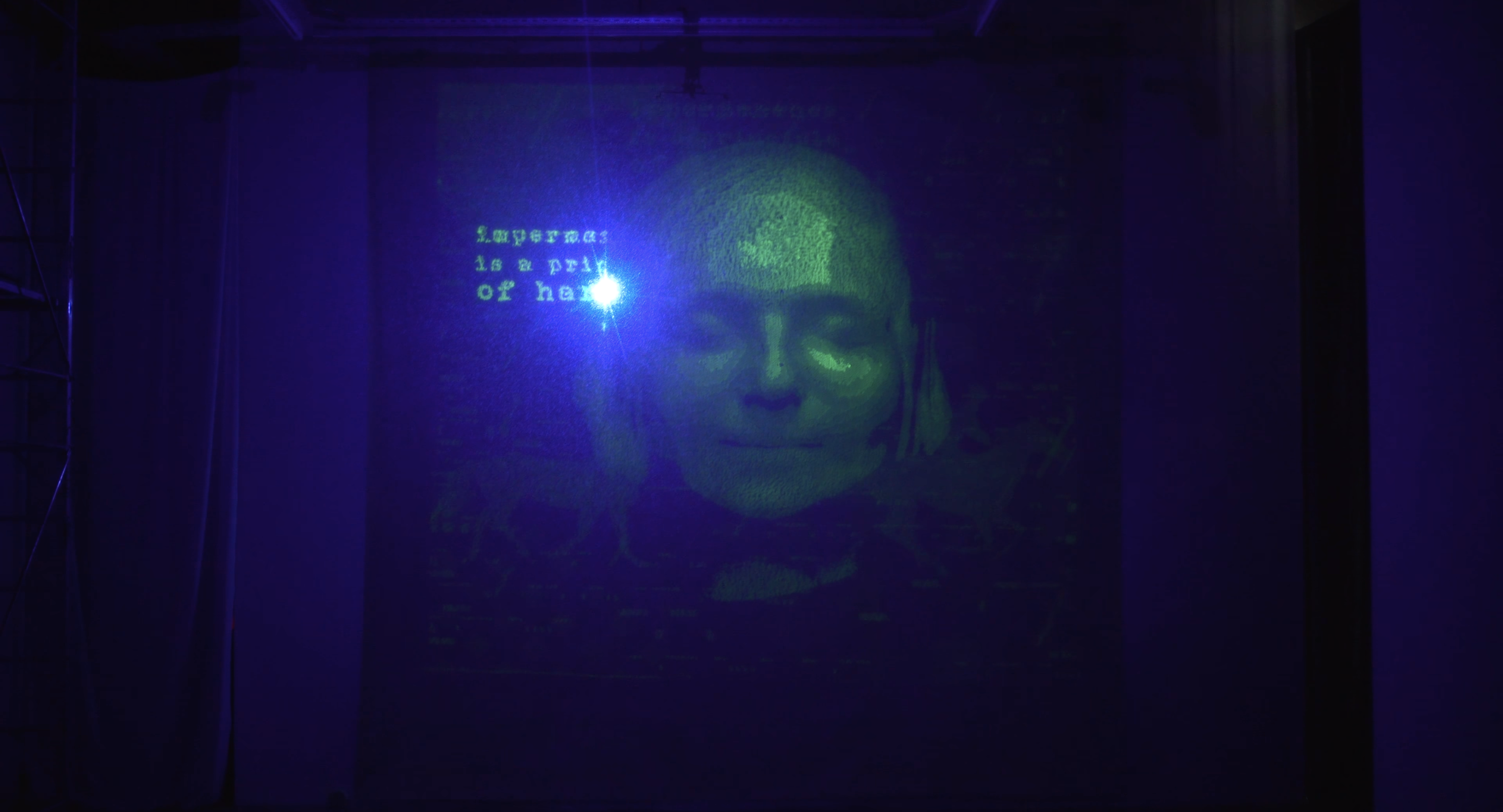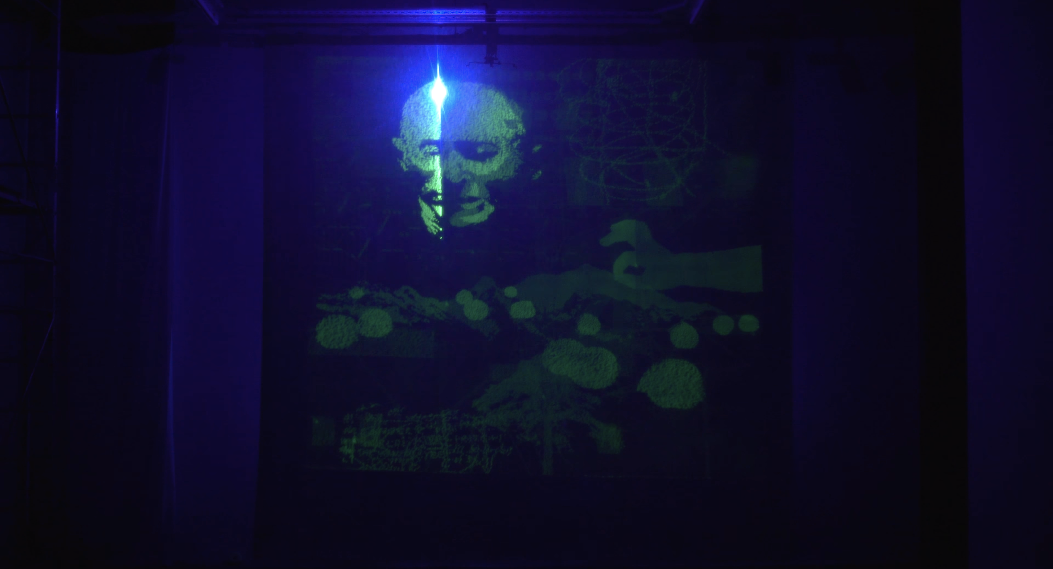 With a purplish-blue UV laser as a projection source and using fully covered painted phosphorescent canvas as the projection surface, after-glowing images are projected that appear line by line (much like a fax or inkjet printer). In this way, the projection canvas records the image. The projected image/text elements will diminish in luminosity over time. New elements are projected as the older ones fade.
