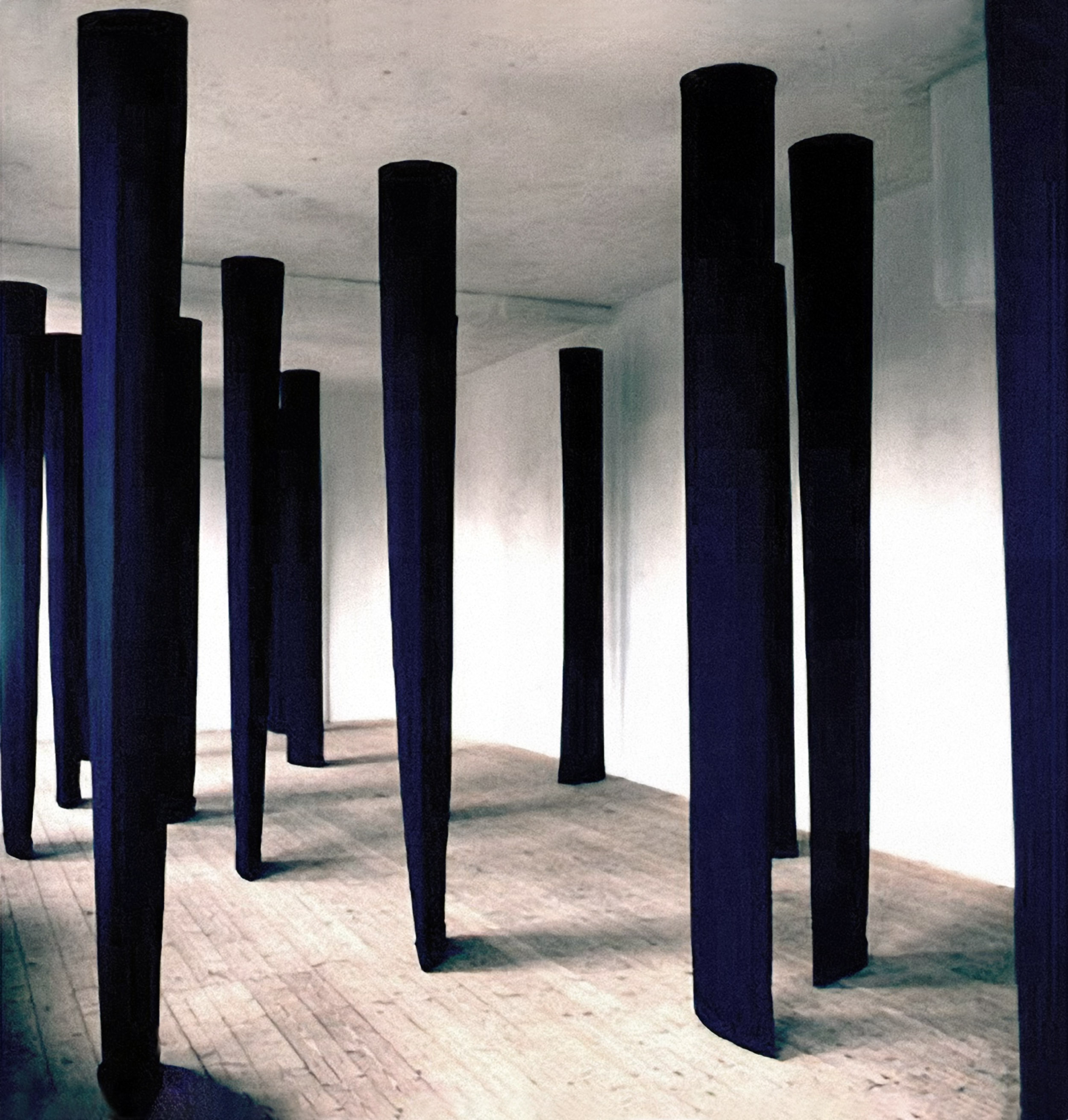 Mixed media, 18 trouser legs Combed yarn, metal, wood